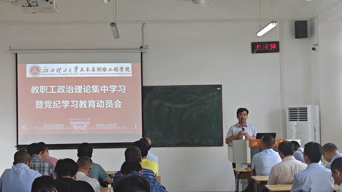 土木与测绘工程学院召开教职工政治理论集中学习暨党纪学习教育动员部署会。学院党委副书记温子恒领学了《中国共产党纪律处分条例》。会议强调,要坚持以习近平新时代中国特色社会主义思想为指导,准确把握开展党纪学习教育的各项要求,组织党员特别是党员领导干部认真学习《中国共产党纪律处分条例》,把遵规守纪刻印在心,内化为言行准则,进一步强化纪律意识、加强自我约束、提高免疫能力,增强政治定力、纪律定力、道德定力、抵腐定力,始终做到忠诚干净担当。