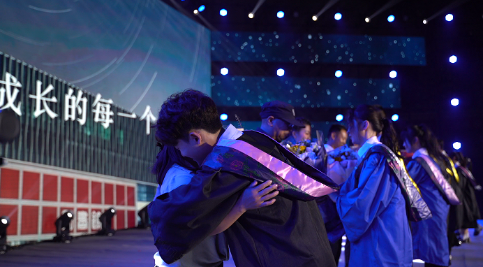 在互动环节《我想对你说》中,毕业生代表依次分享了自己与母校的点点滴滴,深情告别老师与同学,描绘对未来的展望。而后,现场响起热烈的掌声欢迎在我们追梦的途中保驾护航的教职工代表,毕业生代表为其献花,并合影留念。