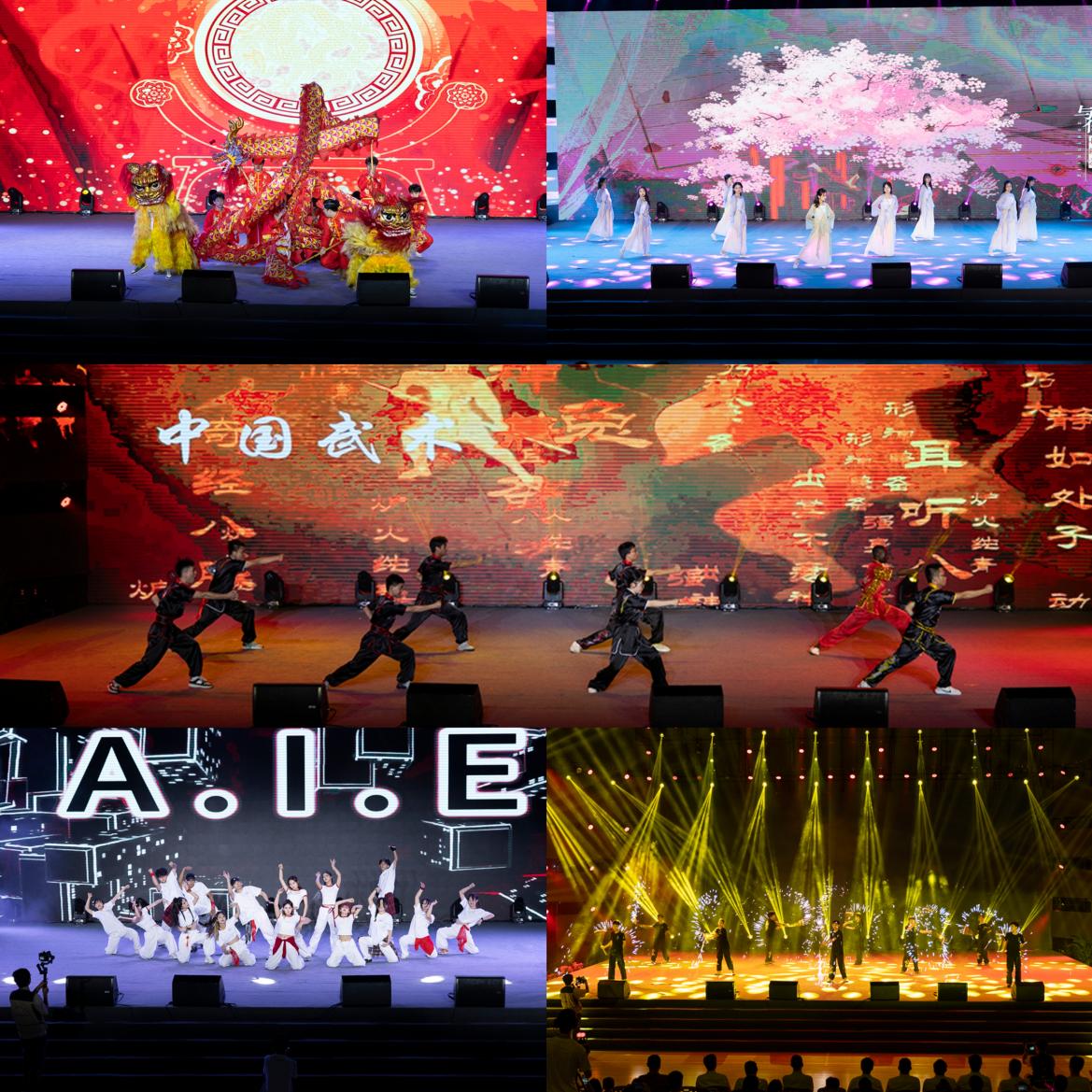 《社彩年华》舞龙舞狮表演气势磅礴,武术表演铿锵有力,古风服饰美轮美奂,街舞表演英姿飒爽,展现了奈飞工厂