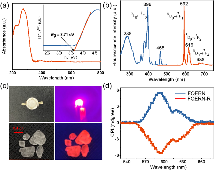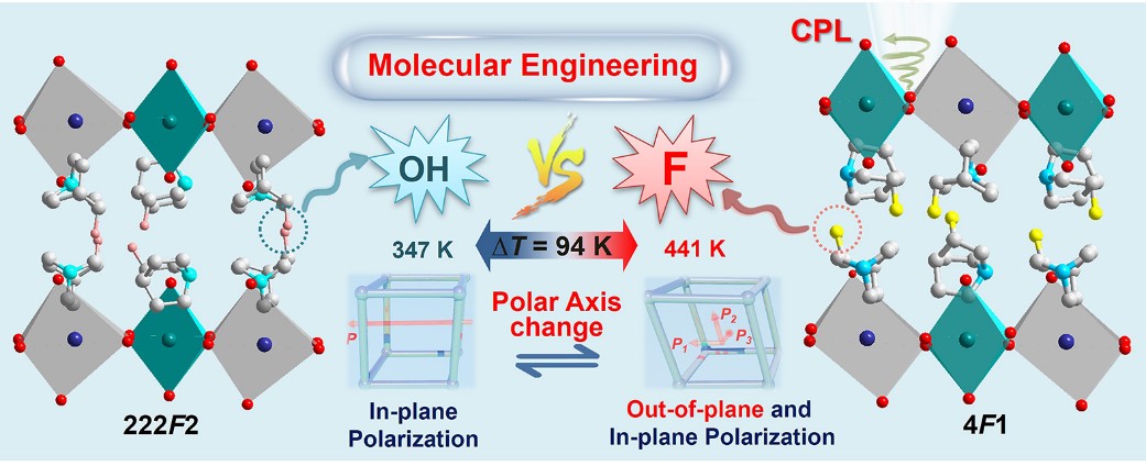 由于层状材料容易成膜,层状铁电材料是制备铁电薄膜器件的首选。尽管最近几年有一些层状铁电配合物报道,但是这些材料大多都只显示面内极化,不利于器件应用。缪乐平等基于“铁电化学”,利用稀土离子丰富的配位模式,引入手性,构建了钙钛矿型层状手性稀土配合物,在有机组分上进行F取代,通过F取代效应成功调节实现了面外极化的铁电性。该材料不仅表现出多极轴面外铁电性和铁电-铁弹性,还具有圆偏振发光(CPL),在下一代微-纳光电器件领域显示了应用潜力(图2)。该成果不但为稀土铁电材料在新光电器件中的应用提供更多可能,也为稀土功能配合物的研究提供了新思路。