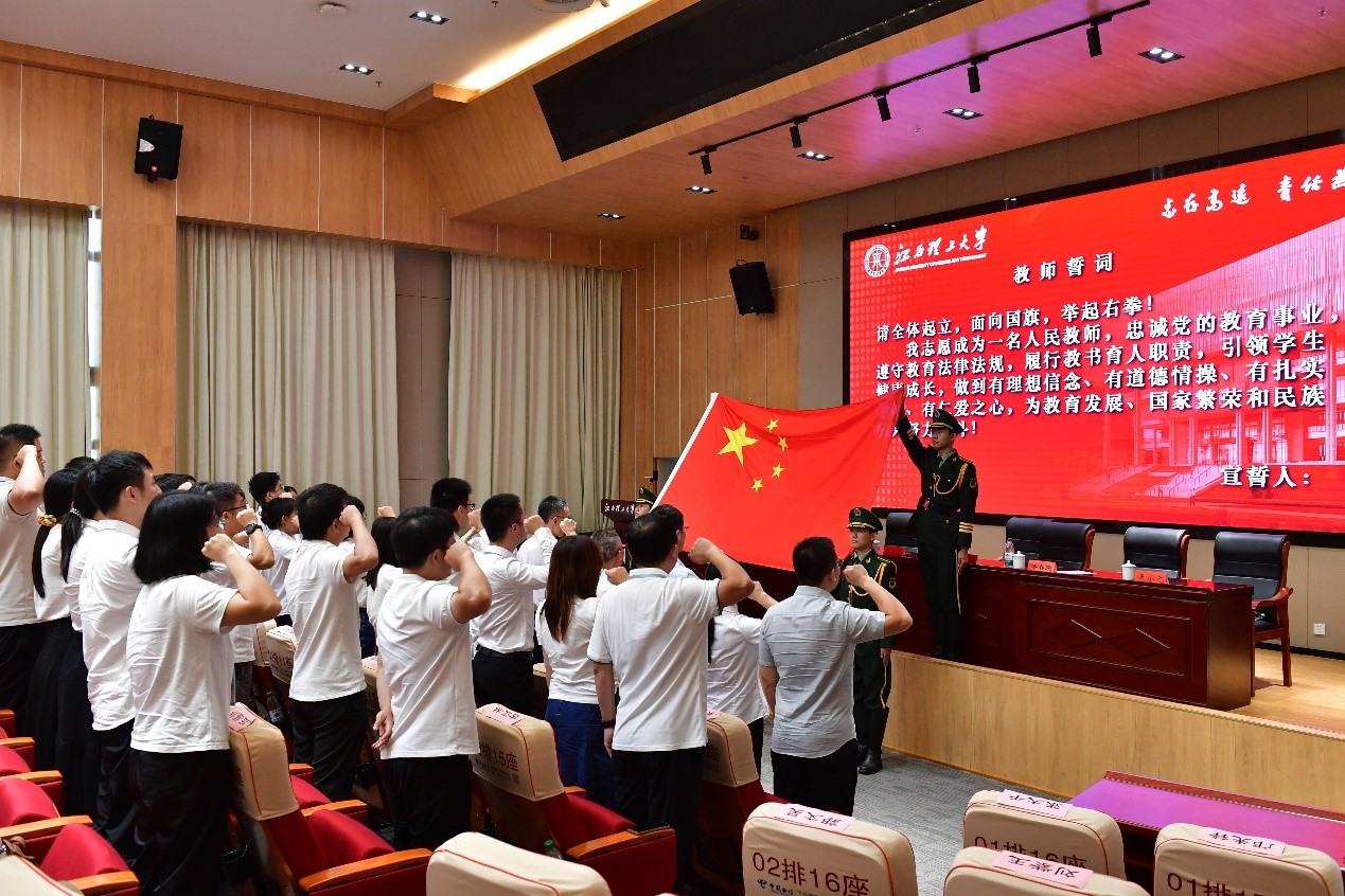 结业仪式上,新入职教师钟春林、傅婷代表全体新入职教师作培训总结发言。最后,全体新入职教师进行了入职宣誓,合唱校歌《我们从这里启航》。