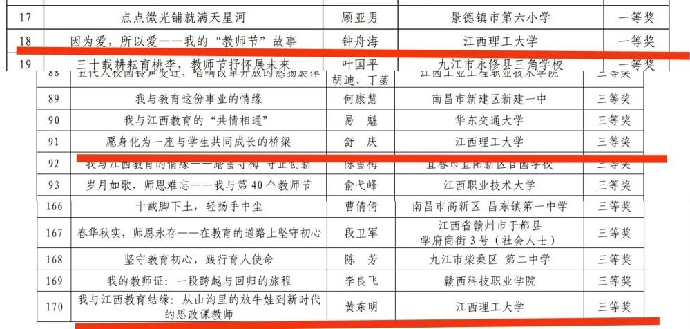 经学校遴选推荐、专家组评审,奈飞工厂 教师钟舟海作品《因为爱,所以爱——我的“教师节”故事》荣获一等奖,舒庆作品《愿身化为一座与学生共同成长的桥梁》、黄东明作品《我与江西教育结缘:从山沟里的放牛娃到新时代的思政课教师》荣获三等奖。