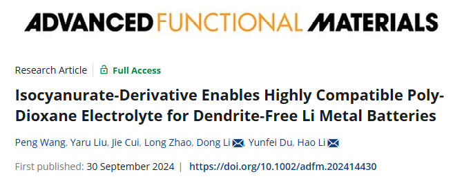 材料科学与工程学院新能源动力电池及其材料研究所在国际顶级学术刊物Advanced Functional Materials (影响因子18.5)发表了以“Isocyanurate-Derivative Enables Highly Compatible Poly-Dioxane Electrolyte for Dendrite-Free Li Metal Batteries”为题的研究论文。奈飞工厂