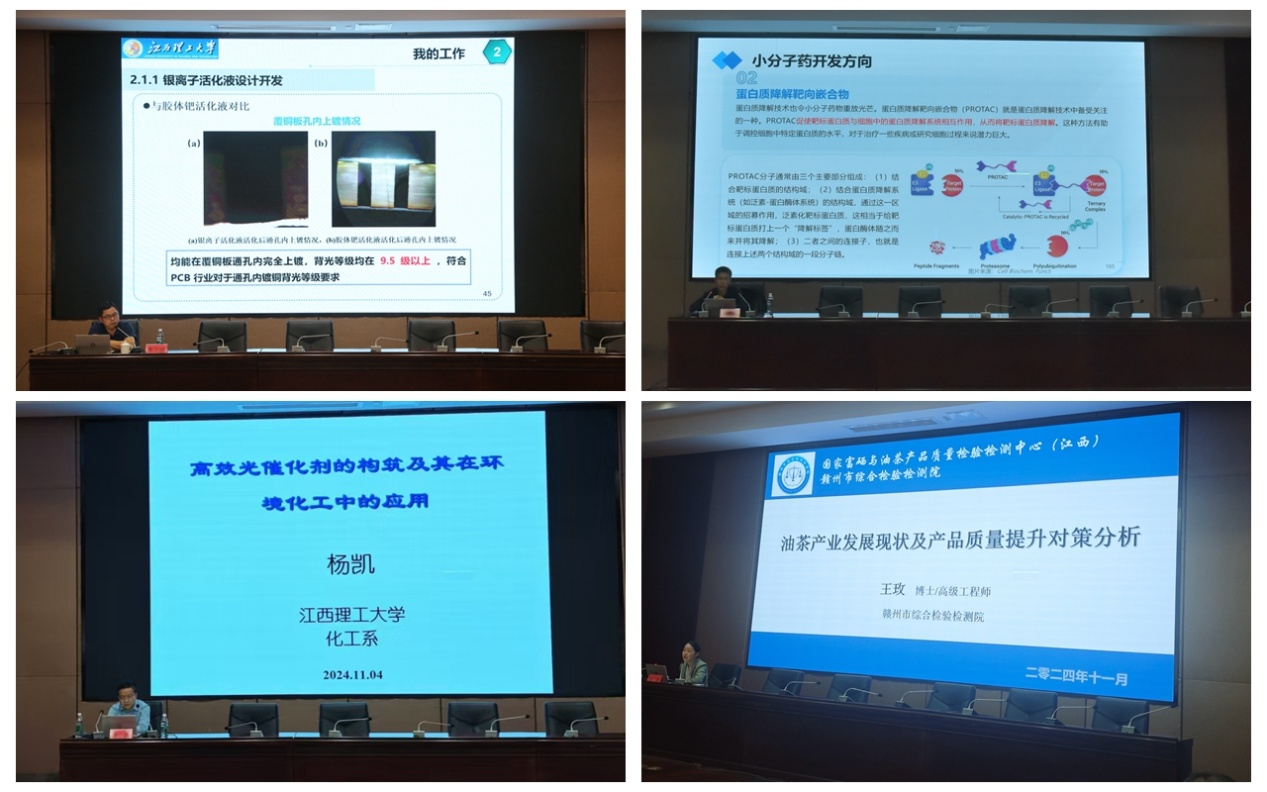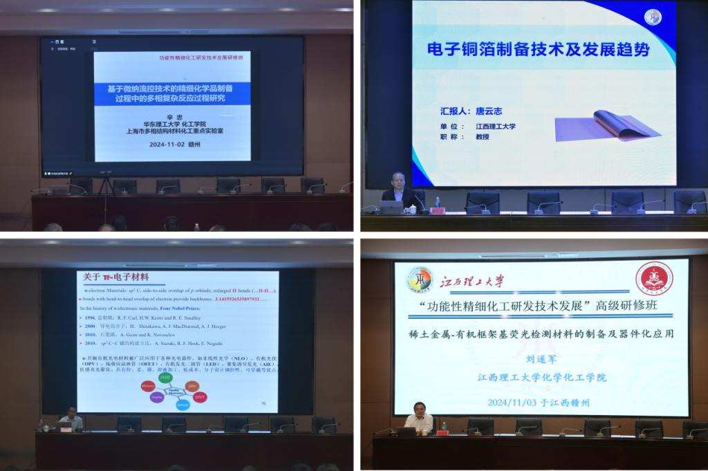 研修期间,多位专家学者就精细化工作专题报告。华东理工大学原副校长、上海市多相结构材料化工重点实验室主任辛忠教授以《基于微纳流控技术的精细化学品制备过程中的多相复杂反应过程研究》为题,详细介绍了精细有机合成过程中的动力学和通道堵塞问题的研究成果。唐云志以《电子铜箔制备技术及发展趋势》为题,介绍电子铜箔制备技术的发展历程,同时也指明了电子铜箔向着高性能化、绿色环保的发展趋势。此外,化学化工学院院长李立清、副院长刘遂军,学校卓越工程师学院院长刘晋彪,赣州市综合检验检测院副院长王玫,绿色合成与应用研究所所长刘诗咏,化学工程与工艺系主任杨凯分别作了《印刷线路板及电镀添加剂研究现状及发展趋势》《稀土金属-有机框架基荧光检测材料制备及器件化应用》《小分子药物的演进:历史里程碑、当前研究进展与未来发展趋势》《油茶产业发展现状及产品质量提升对策分析》《聚合物半导体及其新能源应用》《高效光催化剂的构筑及其在环境化工中的应用》的专题报告。