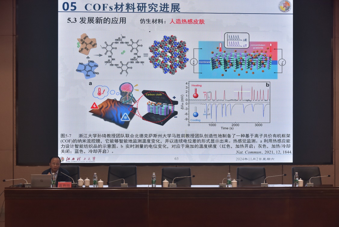 原校长温和瑞首先作了《功能高分子新材料的设计合成与应用-共价有机框架(COFs)材料》的专题报告。报告从共价有机框架材料出发,详细阐述了共价有机框架材料的最新发展和未来技术前景,如拓宽COFs材料应用场景,用于新能源电池、储氢、人造传感皮肤等前沿领域,同时他也强调了COFs材料在未来材料发展领域中所占有的重要地位。