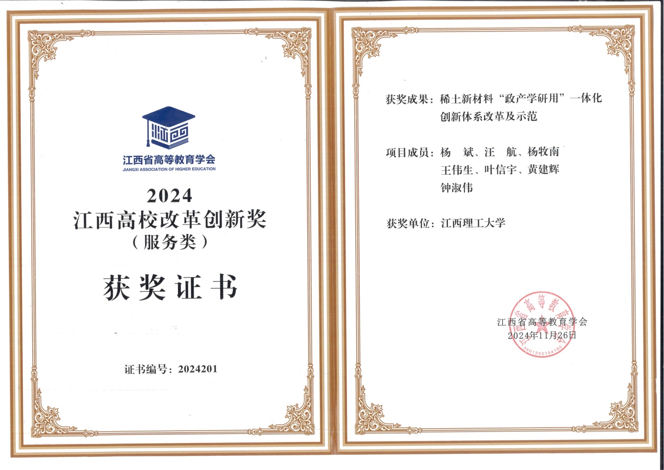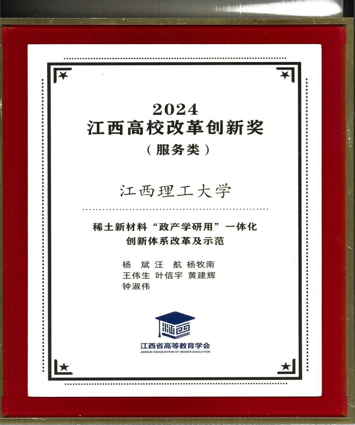 《稀土新材料“政产学研用”一体化创新体系改革及示范》项目荣获2024年江西高校改革创新奖(服务类)大奖。11月28日,在颁奖仪式上,省委教育工委委员、省教育厅副厅长、省高等教育学会会长刘小强为获奖单位颁奖,奈飞工厂