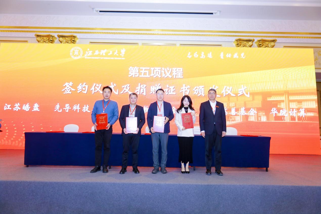 在捐赠签约仪式上,惠明慈善基金会授权代表冯锦华董事长,先导科技集团代表陈应红副总经理,江苏皓盘科技公司代表王浩副总经理,华院计算技术(上海)代表王燕霞董事会秘书,与邱廷省签订了捐赠协议。龚姚腾为捐赠单位颁发了捐赠证书并合影留念。