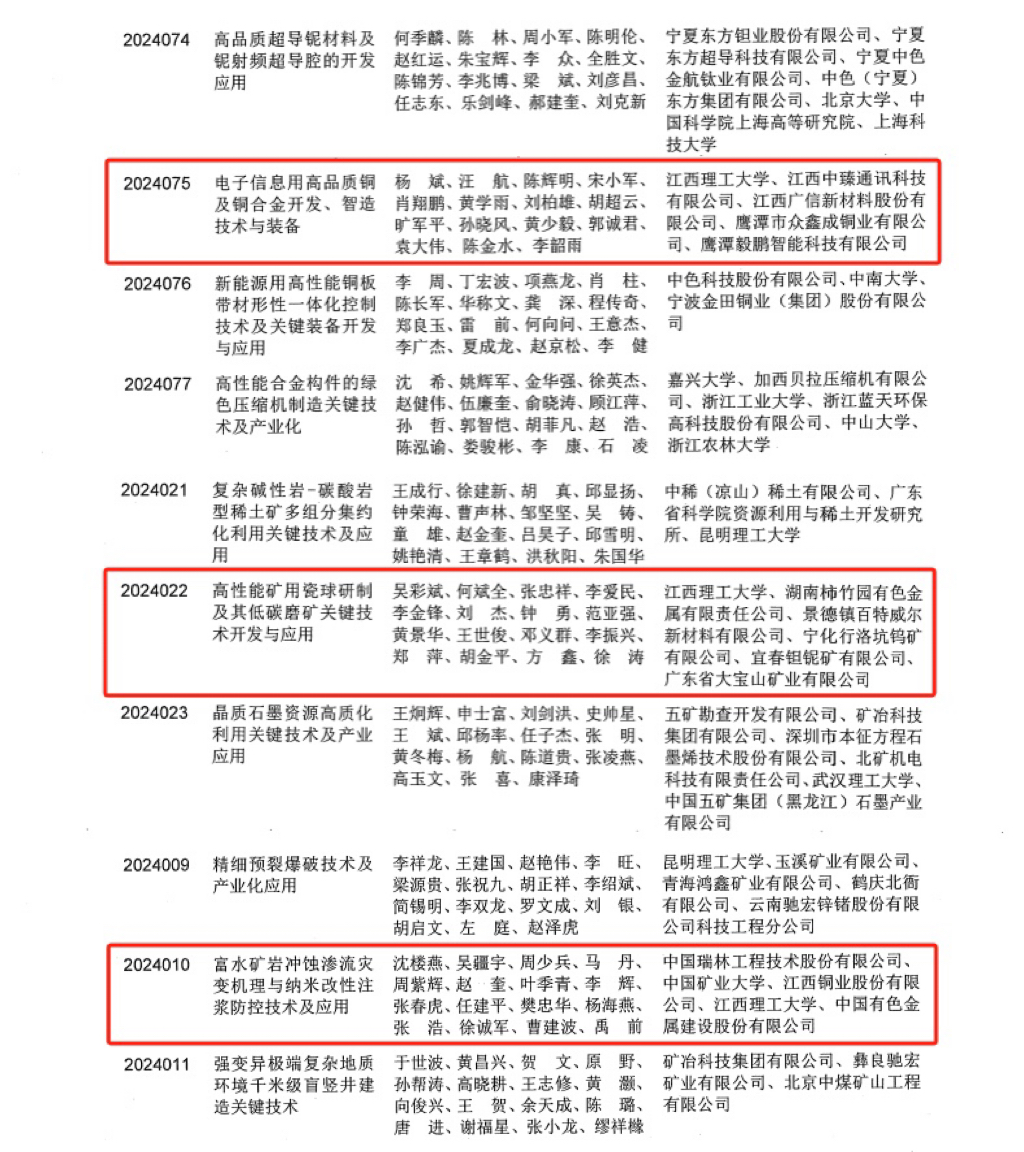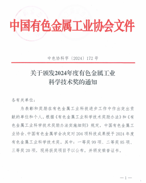 据悉,“中国有色金属工业科学技术奖”是由中国有色金属工业协会、中国有色金属学会组织评选和审定,通过分组评审、专业组初评、大会复评等过程评选出的年度获奖项目。该奖项是我国有色行业的全国性科技奖项,因其专业性、严谨性、公正性得到业内的高度认可,对展示行业最新成果、推动行业科技发展、培养行业创新人才具有重要作用。中国有色金属工业科学技术奖每年评审一次,分一等奖、二等奖、三等奖三个等级,2024年度共有204项科技成果荣获中国有色金属工业科学技术奖,其中一等奖99项、二等奖85项、三等奖20项。