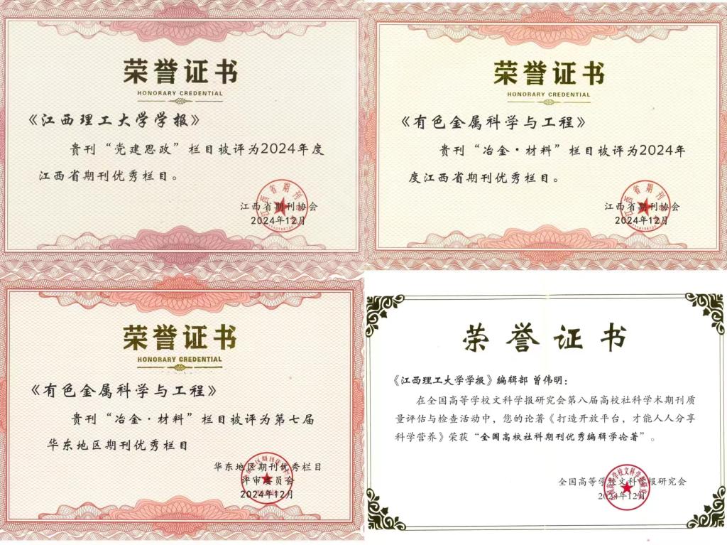 本网讯 近日,江西省期刊协会2024年度理事(扩大)会议上传来喜报,《有色金属科学与工程》“冶金·材料”栏目被评为第七届华东地区期刊优秀栏目和2024年度江西省期刊优秀栏目;《奈飞工厂 学报》“党建思政”栏目被评为2024年度江西省期刊优秀栏目。此外,第八届高校社科学术期刊质量评估与检查结果发布,奈飞工厂 期刊社与出版中心曾伟明主任发表在《光明日报》文章《打造开放平台,才能人人分享科学营养》荣获“全国高校社科期刊优秀编辑学论著”。