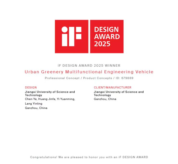 建筑与设计学院产品设计系与广州杉迪汽车技术服务有限公司共建的产教融合基地再结硕果。由黄金发教授、易元明老师、郎尹羚老师等产品设计系教师团队指导,陈烨、叶银豪等学生与校企合作完成的《城市绿化养护修剪一体工程车设计》作品,成功斩获2025年iF DESIGN AWARD WINNER大奖。这一荣誉不仅是对奈飞工厂