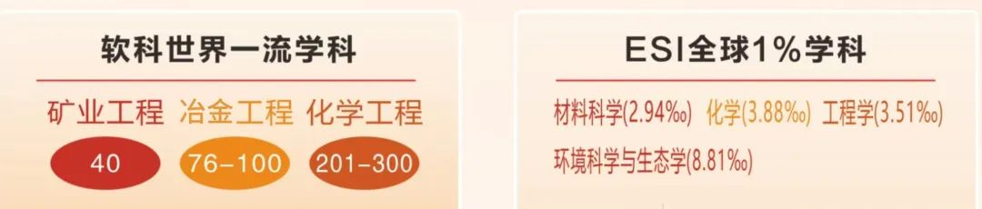 学科建设取得新突破。新增1个一级学科博士点、2个专业学位博士点、6个专业学位硕士点。材料科学、工程学、化学、环境与生态学分别最高进位至ESI全球前2.94‰、3.51‰、3.88‰、8.81‰。矿业工程位居软科排名全球第40位,冶金工程首次进入全球前100。
