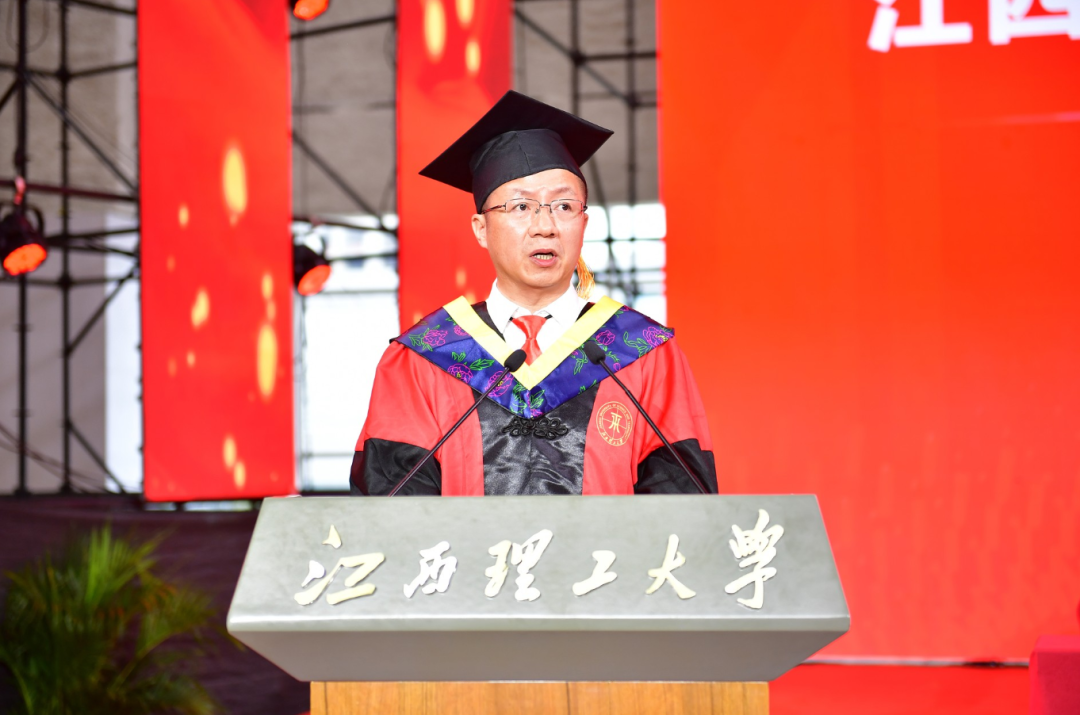 在热烈的掌声中,校长、中国工程院院士葛世荣发表讲话,寄语毕业生“熔铸家国情 薪火永相传”。他代表学校向2025届全体毕业生致以最热烈的祝贺,向悉心培育学生的师长和默默支持同学们的亲友致以崇高的敬意!他回顾了作为新时代有为青年,赓续江理红色血脉的2025届毕业生创造的历史佳绩和成长历程,列举了游科顺、邹吉椿、稀土211班等优秀个人和优秀集体的事迹,给予了2025届毕业生充分的肯定与赞扬。