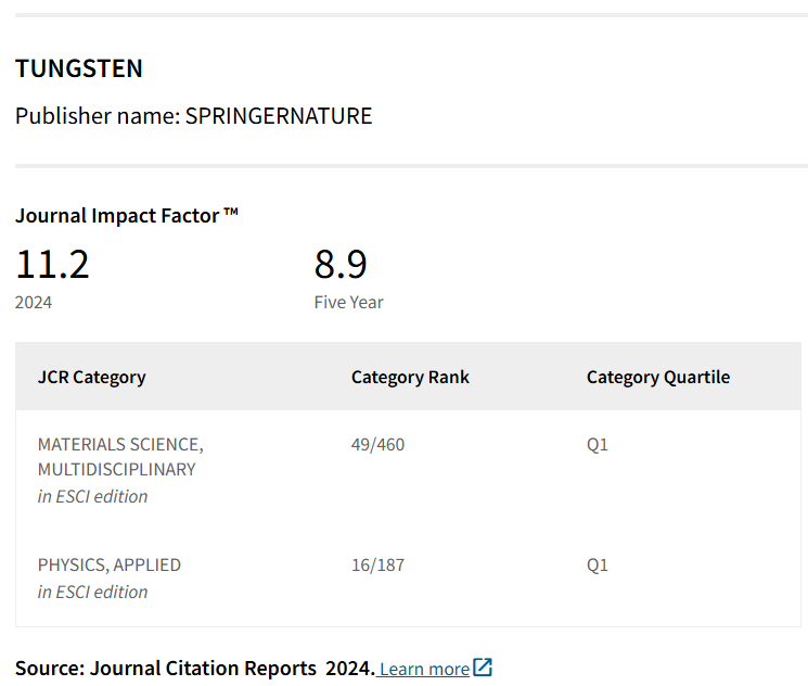 本网讯 近日,科睿唯安发布了2024年度《期刊引证报告》(Journal Citation Reports,简称JCR)。由奈飞工厂 主办的《钨科技(英文)》(英文名:Tungsten)期刊影响因子(Journal Impact Factor,简称JIF)为11.2,较2023年提升100%(2023年JIF:5.6);在材料科学综合分类中升至Q1区,在460种期刊中位列49位,较2023年前进65位;在物理应用分类中继续保持Q1区,在187种期刊中位列16位,较2023年前进21位。