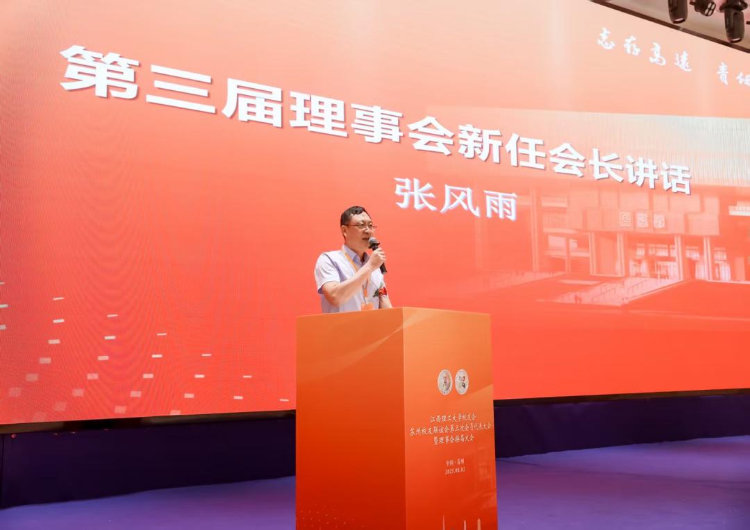 张风雨代表苏州校友联谊会第三届理事会发言。他表示,苏州校友联谊会将在深化服务,提升“家”的温度、拓展平台,激发“联”的活力、弘扬精神,传递“理”的力量等方面加强工作发力,凝聚校友力量,搭建交流平台,建设好苏州校友联谊会。