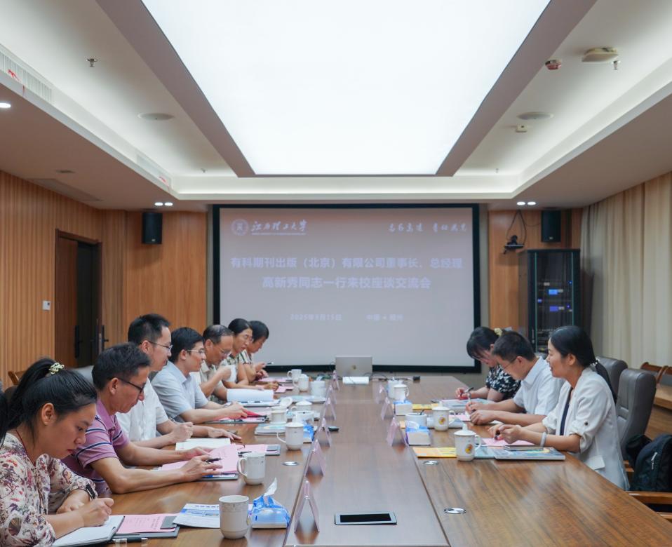 本网讯 9月15日下午,有科期刊出版(北京)有限公司(以下简称“有科出版”)董事长、总经理高新秀一行来访。副校长汪航在三江校区濂溪楼四号会议室会见来宾并召开座谈交流会。会议由校期刊社与出版中心主任曾伟明主持。