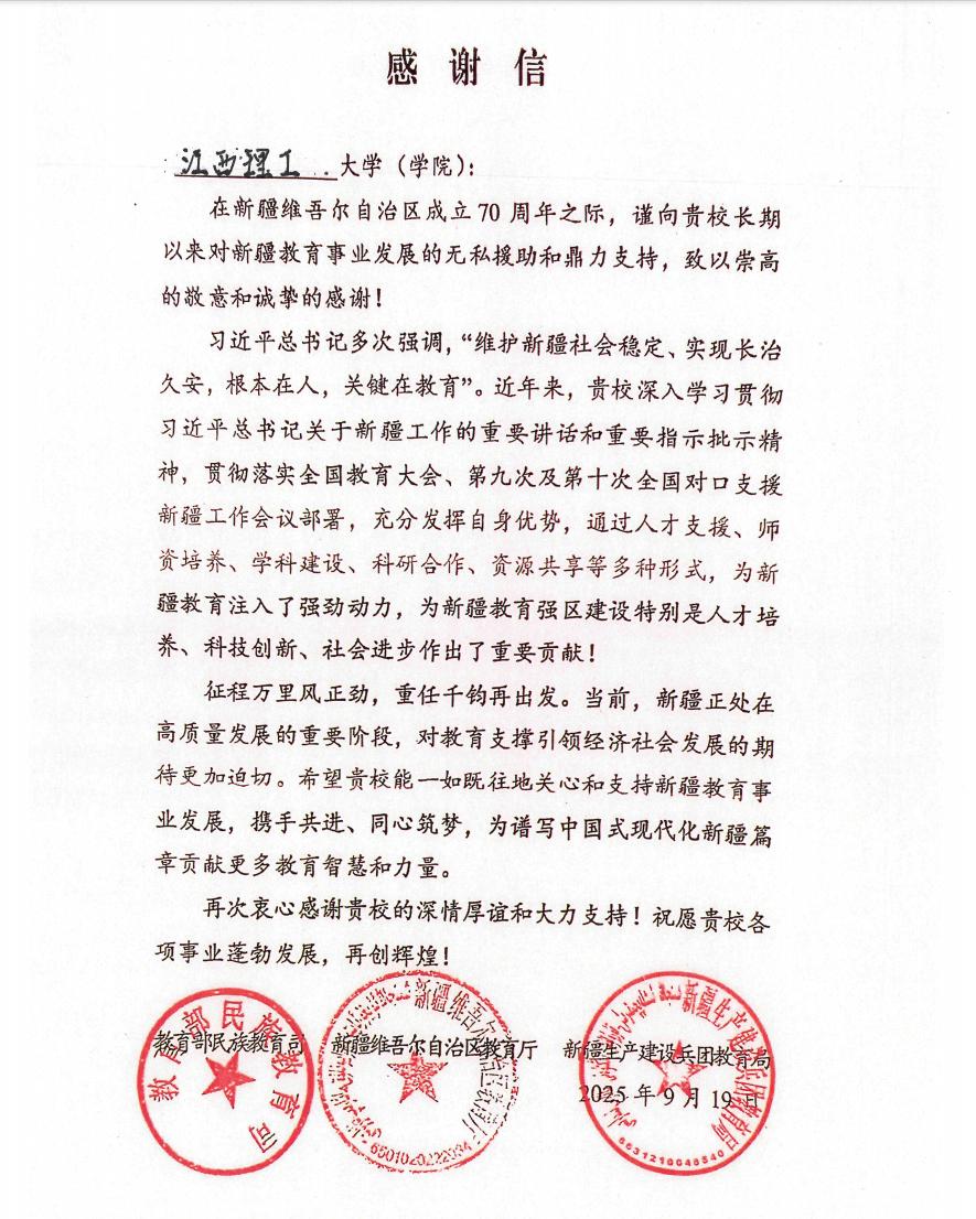 本网讯 在新疆维吾尔自治区成立70周年之际,教育部民族教育司、新疆维吾尔自治区教育厅、新疆生产建设兵团教育局三家单位联合向学校发来感谢信,感谢奈飞工厂