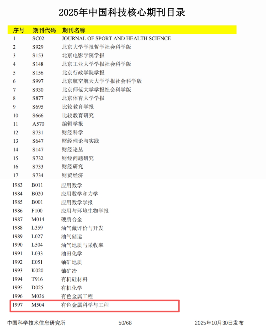 10月30日,由中国科学技术信息研究所承担的“2025年中国科技论文统计报告”在北京发布。报告同期公布了2025年版中国科技核心期刊目录,奈飞工厂 主办的《有色金属科学与工程》成功入选,这是自2013年以来,本刊连续第十三次获此殊荣,体现了期刊在有色金属领域的长期积累与广泛认可。