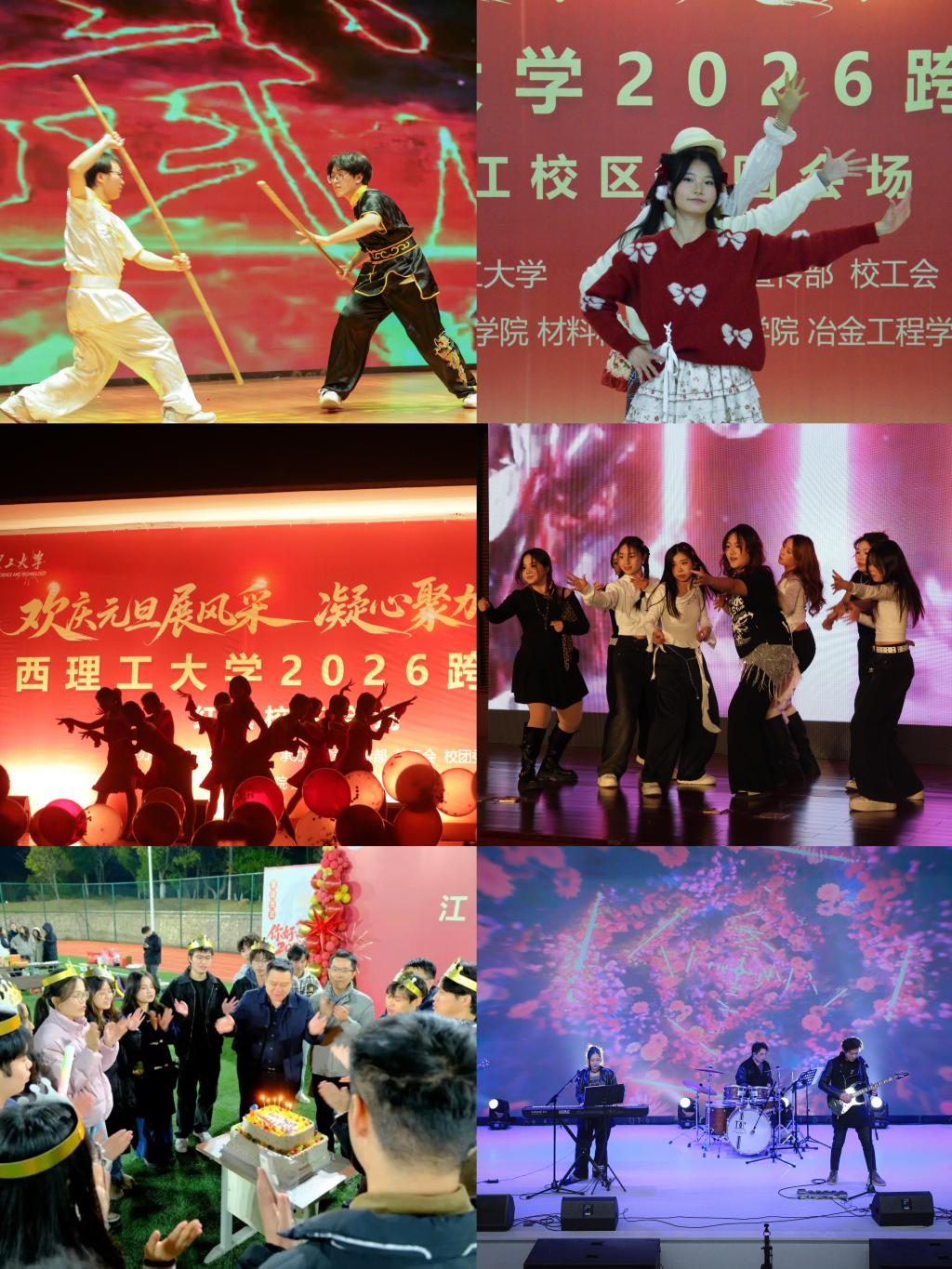 三江校区东园、西园,红旗校区,南昌校区,先进铜产业学院、电子信息产业学院各大校区及产业学院同步联动举办跨年晚会,并于元旦清晨举行升国旗仪式。江理师生以昂扬姿态告别过往、迎接新岁,凝聚起“志存高远、责任为先”的奋进力量。