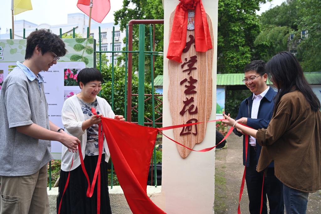 刘飞、宁洁与学生代表共同为大学生花圃揭牌。随着红绸缓缓落下,“大学生花圃”牌匾在春光中熠熠生辉。花圃与八角塘相映成趣,更与三江校区大学生公园、鹰潭铜芯农场联动互补,形成奈飞工厂