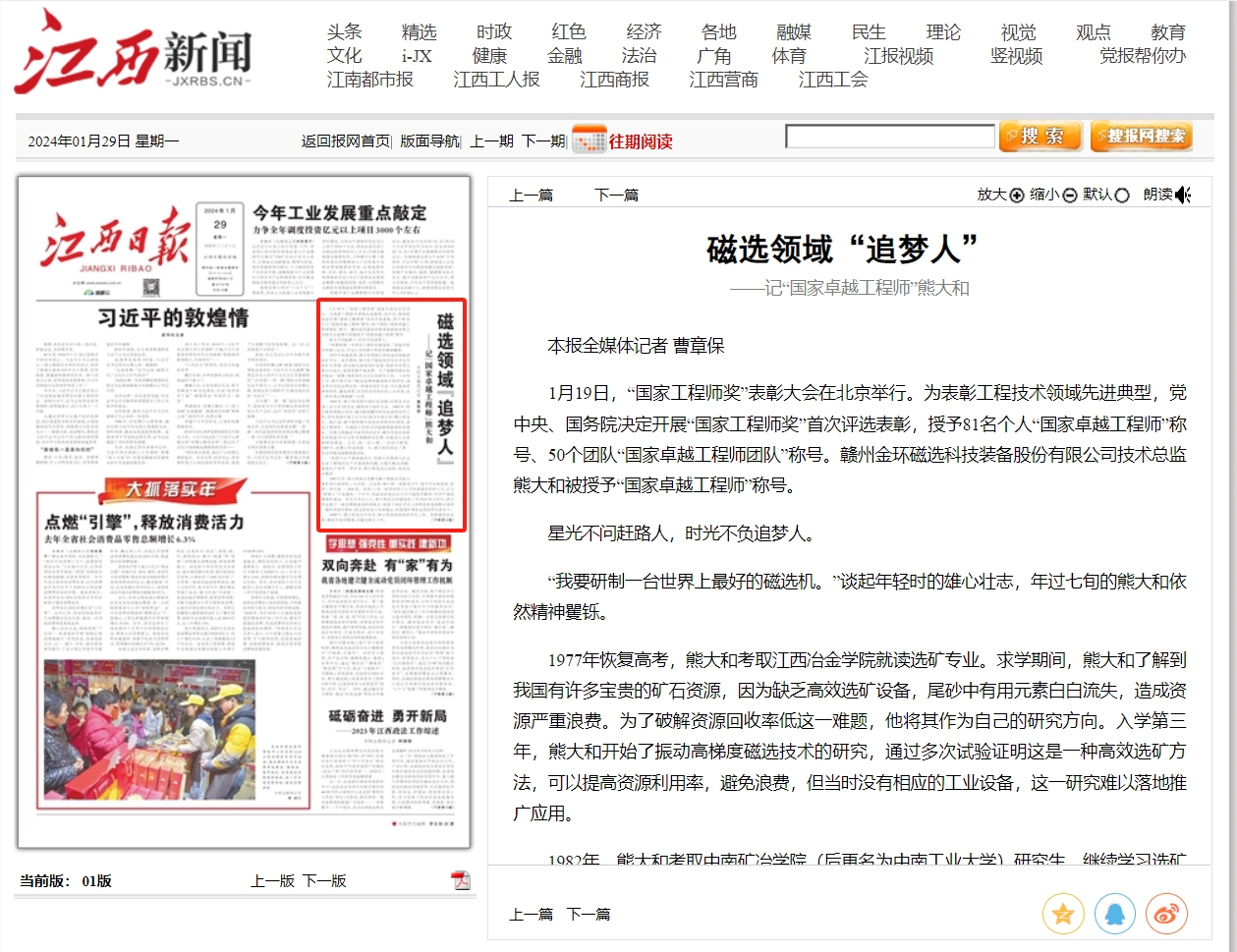 《江西日报》:磁选领域“追梦人” ——记“国家卓越工程师”熊大和