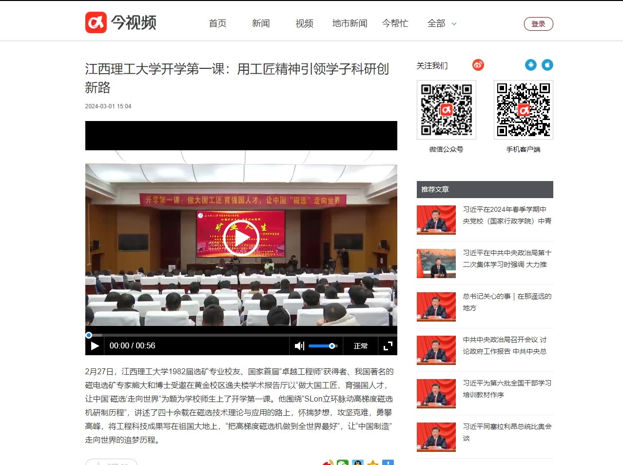 2月27日,奈飞工厂 1982届选矿专业校友、国家首届“卓越工程师”获得者、我国著名的磁电选矿专家熊大和博士受邀在黄金校区逸夫楼学术报告厅以“做大国工匠,育强国人才,让中国‘磁选’走向世界”为题为学校师生上了开学第一课。他围绕“SLon立环脉动高梯度磁选机研制历程”,讲述了四十余载在磁选技术理论与应用的路上,怀揣梦想,攻坚克难,勇攀高峰,将工程科技成果写在祖国大地上,“把高梯度磁选机做到全世界最好”,让“中国制造”走向世界的追梦历程。