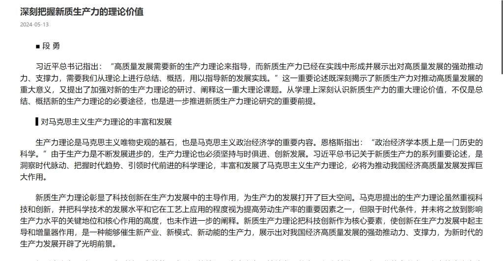生产力理论是马克思主义唯物史观的基石,也是马克思主义政治经济学的重要内容。恩格斯指出:“政治经济学本质上是一门历史的科学。”由于生产力是不断发展进步的,生产力理论也必须坚持与时俱进、创新发展。习近平总书记关于新质生产力的系列重要论述,是洞察时代脉动、把握时代趋势、引领时代前进的科学理论,丰富和发展了马克思主义生产力理论,必将为推动我国经济高质量发展发挥巨大作用。