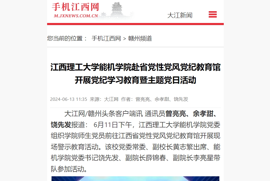 能机学院党委组织学院师生党员前往江西省党性党风党纪教育馆开展现场警示教育活动。该校党委常委、副校长黄志繁出席、能机学院党委书记饶先发、副院长薛锦春、副院长李亮星带队参加活动。