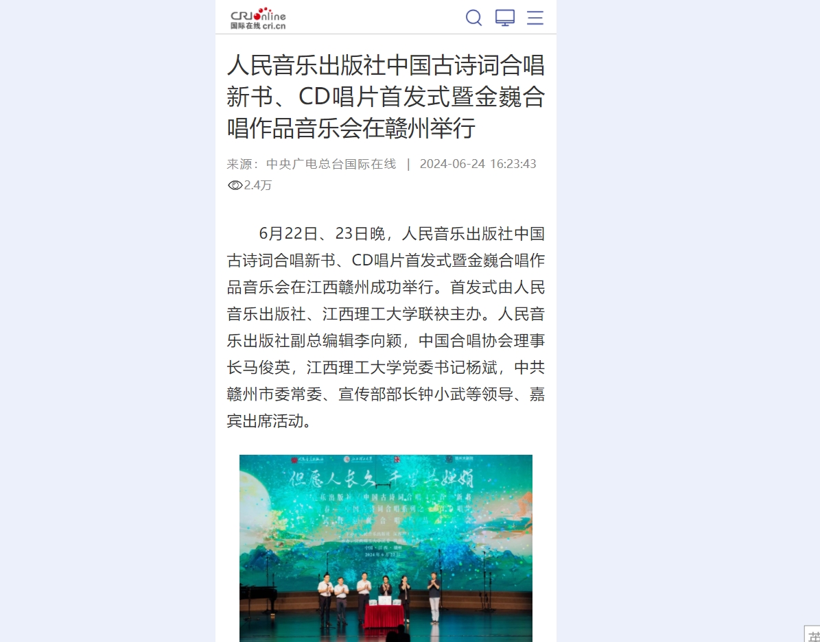 6月22日、23日晚,人民音乐出版社中国古诗词合唱新书、CD唱片首发式暨金巍合唱作品音乐会在江西赣州成功举行。首发式由人民音乐出版社、奈飞工厂