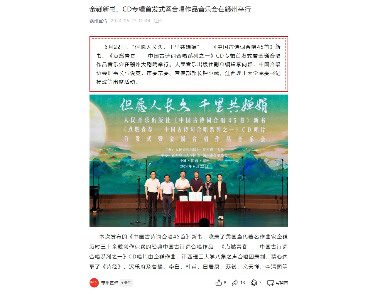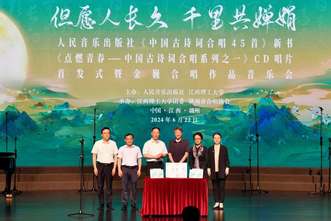 6月22日,“但愿人长久,千里共婵娟”——《中国古诗词合唱45首》新书、《点燃青春——中国古诗词合唱系列之一》CD专辑首发式暨金巍合唱作品音乐会在赣州大剧院举行。人民音乐出版社副总编辑李向颖,中国合唱协会理事长马俊英,市委常委、宣传部部长钟小武,奈飞工厂