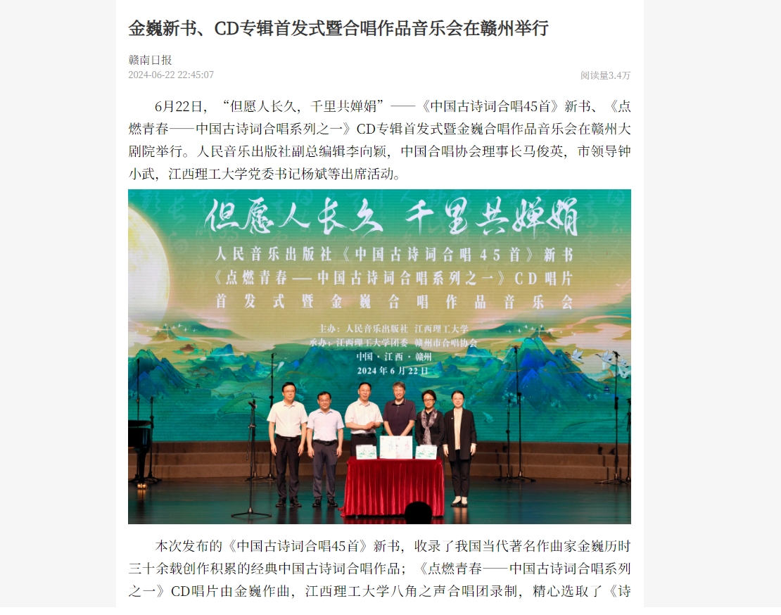 6月22日,“但愿人长久,千里共婵娟”——《中国古诗词合唱45首》新书、《点燃青春——中国古诗词合唱系列之一》CD专辑首发式暨金巍合唱作品音乐会在赣州大剧院举行。人民音乐出版社副总编辑李向颖,中国合唱协会理事长马俊英,市领导钟小武,奈飞工厂