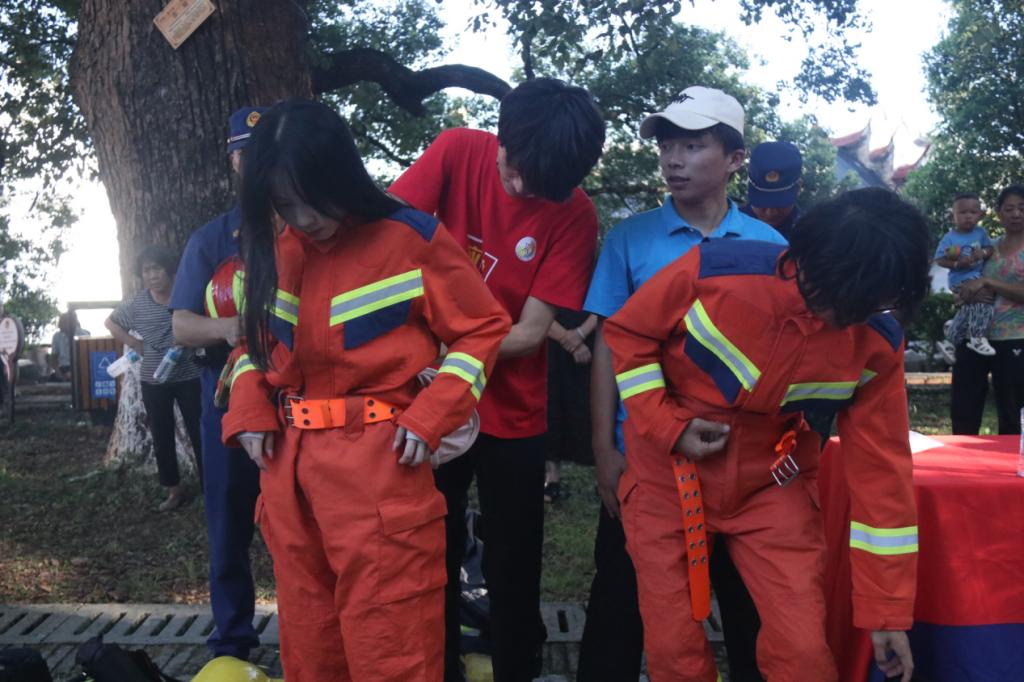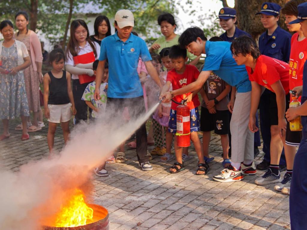 在趣味运动会开始前,实践队成员还协助消防员为村民们讲解、展示了基本的消防救援服装和灭火器材使用方法,并引导村民们积极参与体验。