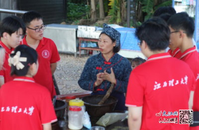 “老师傅,这客家古文的唱词可有什么特别的讲究”,“大姐,擂茶研磨的力度和节奏是不是也有诀窍呀”,实践队员们充满热情与好奇,像好奇宝宝一样不停追问非遗文化技巧。