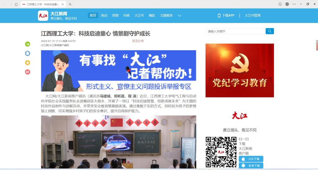 本次活动受到了学校师生和家长的热烈欢迎。孩子们表现出了极高的参与热情,家长们对活动给予了积极评价:“希望孩子们能有更多这样的机会接触科技,开阔视野。”在活动中,江理学子以实际行动践行社会责任,不仅为孩子们的科技梦想插上了翅膀,还在乡村儿童的安全教育上贡献出青年力量。