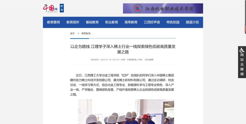 冶金工程学院“红炉”实践队的同学们深入中国稀土集团赣州友力稀土科技开发有限公司、晨光稀土新材料有限公司,通过走访调研、校友访谈、一线学习等方式,结合冶金工程专业、新能源科学与工程专业特色,深入产业一线,产学融合,围绕绿色发展、产线升级探索稀土企业的绿色低碳高质量发展之路。