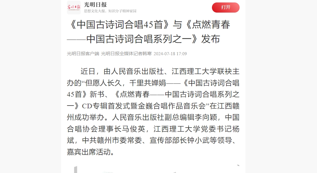 联袂主办的“但愿人长久,千里共婵娟——《中国古诗词合唱45首》新书、《点燃青春——中国古诗词合唱系列之一》CD专辑首发式暨金巍合唱作品音乐会”在江西赣州成功举办。人民音乐出版社副总编辑李向颖,中国合唱协会理事长马俊英,奈飞工厂