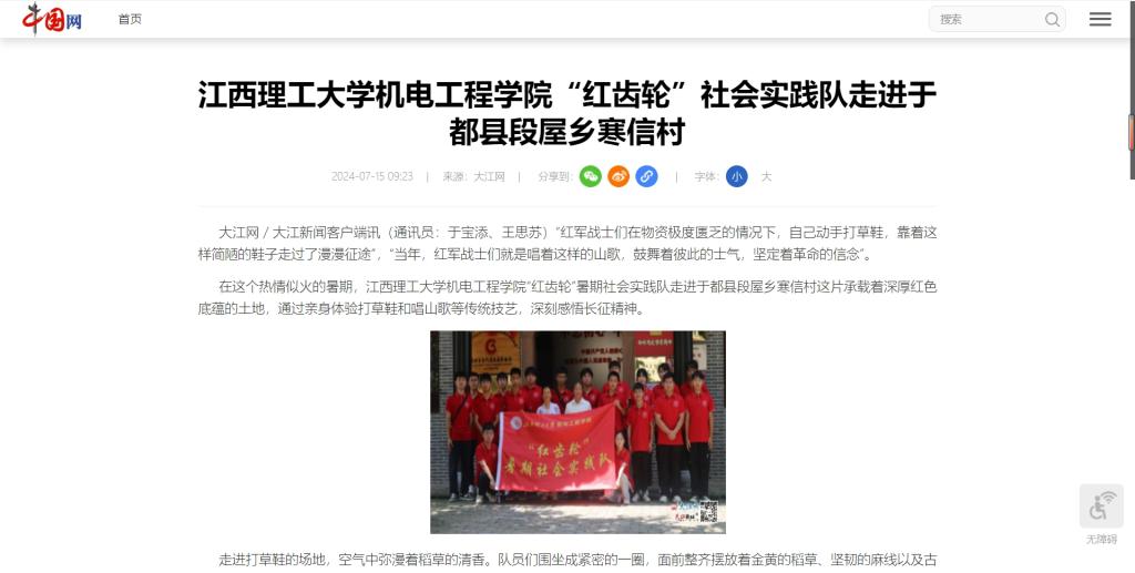机电工程学院“红齿轮”暑期社会实践队走进于都县段屋乡寒信村这片承载着深厚红色底蕴的土地,通过亲身体验打草鞋和唱山歌等传统技艺,深刻感悟长征精神。