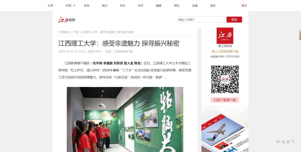 土木与测绘工程学院“红土护圩,遂心井冈”2024年暑期“三下乡”社会实践队来到遂川县草林镇,感受非遗工艺与民俗文化的深厚魅力,探寻当地“以茶立县”沏出的一杯文旅“香茗”。