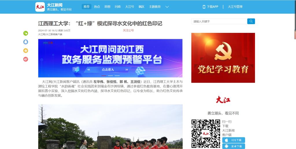 “水韵铸魂”实践团由给排水科学与工程专业的学生组成,旨在将专业知识运用到社会实践中,用“红+绿”的创新发展模式,探寻水文化与红色文化的融合。目前实践团已前往赣州、吉安等多地,利用当地红色资源、联合童心港湾,开展了多场科考实践活动,在文化资源保护传承事业中,书写青春答卷。