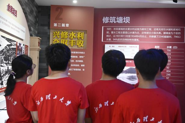 队员们走进江西瑞金中央苏区水利史陈列馆,听着讲解员对“水利丰碑”历史浮雕组合“六个系列第一”的介绍,队员们深深感受到了广大军民团结奋斗、艰苦创业推进水利事业的光荣传统和革命精神。