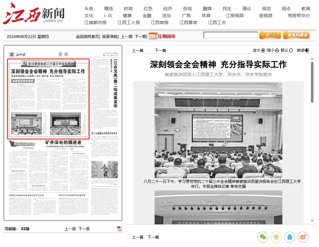 八月二十一日上午,学习贯彻党的二十届三中全会精神省委宣讲团宣讲报告会在萍乡市举行。 本报全媒体记者 陈记昌摄