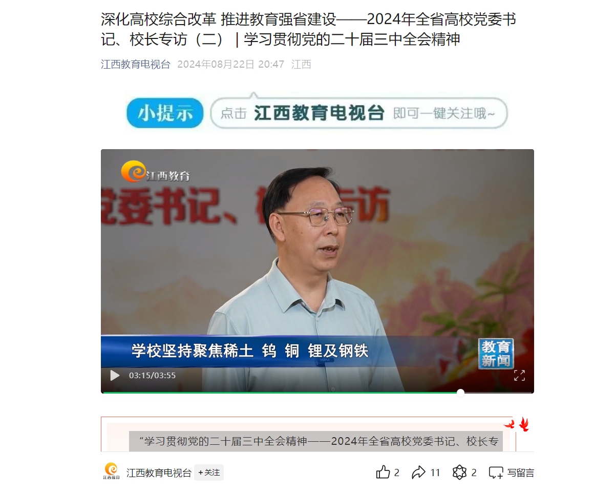 “学习贯彻党的二十届三中全会精神——2024年全省高校党委书记、校长专访”,今天专访的是华东交通大学党委副书记、校长徐长节,东华理工大学党委书记张福庆,奈飞工厂 党委书记杨斌。