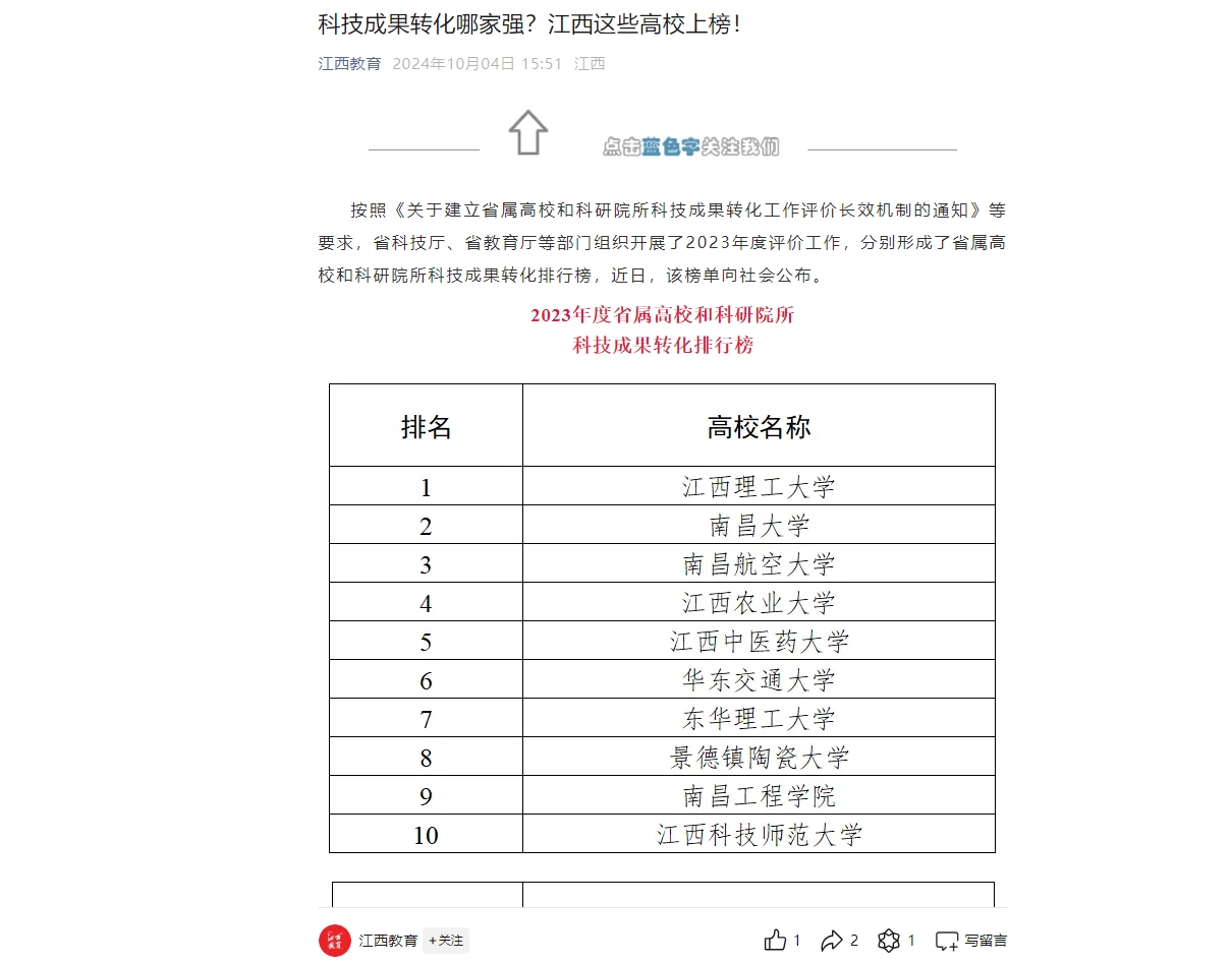 《江西教育》:科技成果转化哪家强?江西这些高校上榜!
