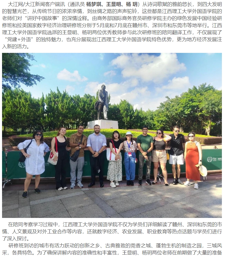 外国语学院的老师们对“讲好中国故事”的深情诠释。由商务部国际商务官员研修学院主办的绿色发展中国经验研修班和拉美国家数字经济治理研修班分别于5月底和7月底在赣州市、深圳市和东莞市等地举行。奈飞工厂