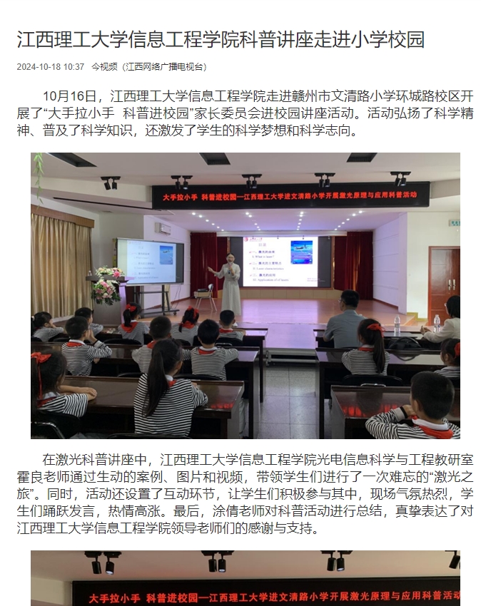 走进赣州市文清路小学环城路校区开展了“大手拉小手 科普进校园”家长委员会进校园讲座活动。活动弘扬了科学精神、普及了科学知识,还激发了学生的科学梦想和科学志向。