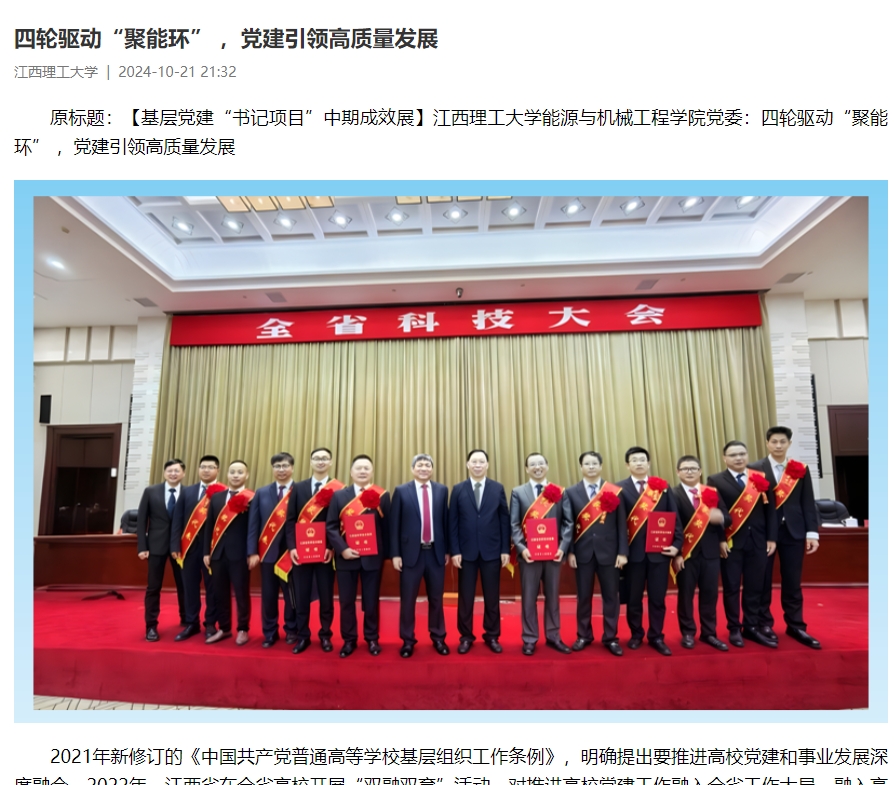 教学科研取得新进展。学院党委坚持以打造“聚能环”党建品牌为契机,将党建和业务工作相融合、系部与支部力量相聚合、科研与实践相结合、“校企政院”相汇合,着力提升学院核心竞争力。今年以来,学院成功申报并获批专业硕士学位点1个、江西省重点实验室1个,省部级及以上科研项目7项、出版著作4部,发表高水平论文15篇。潘小青教授主编的两门课程分获江西省“十四五”普通高等教育本科省级规划教材重点立项项目和第六届江西省普通高等学校优秀教材二等奖。帅词俊教授主持的《可降解骨植入物的可控制备与功能设计研究》荣获江西省科学技术奖自然科学奖一等奖,科技成果转化成效屡创新高,增材制造团队“可降解复合材料增材制造工艺开发与应用中试项目”技术成果转化额高达1132.14万元。