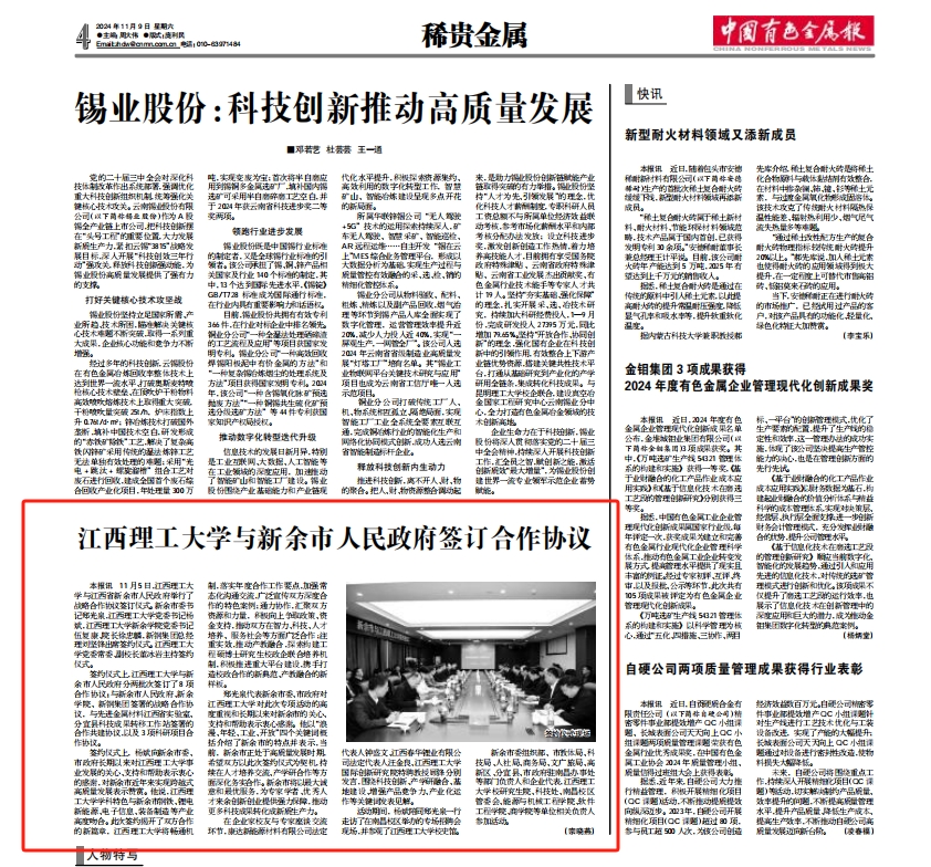 对此次专项活动的高度重视和长期以来对新余市的关心、支持和帮助表示衷心感谢。他以“浪漫、年轻、工业、开放”四个关键词概括介绍了新余市的特点并表示,当前,新余市正处于高质量发展时期,希望双方以此次签约仪式为契机,持续在人才培养交流、产学研合作等方面深化务实合作。新余市将以最大诚意和最优服务,为专家学者、优秀人才来余创新创业提供强力保障,推动更多科技成果转化成新质生产力。