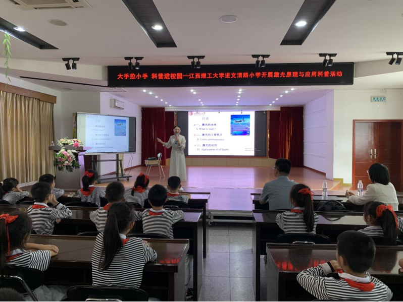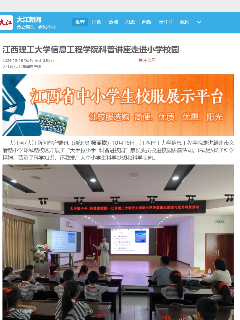 走进赣州市文清路小学环城路校区开展了“大手拉小手 科普进校园”家长委员会进校园讲座活动。活动弘扬了科学精神、普及了科学知识,还激发广大中小学生科学梦想和科学志向。