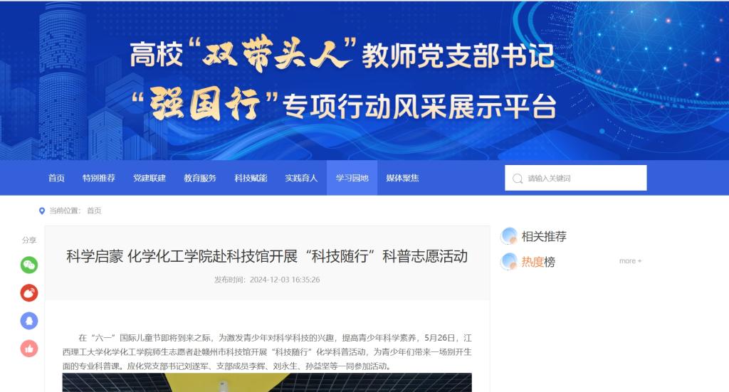 应化党支部充分把握双带头人工作室建设的机遇,围绕党建、科研、教学和学科发展的中心任务,开展星光引航工程,通过“星引领、星示范、星服务”三星行动,压实责任,推进支部建设。本次“科技随行”化学科普活动为应化党支部开展星示范活动的典型范例,通过1个科普团队+1个科普基地+1个科普品牌的科普传播方式,发挥党建工作示范作用,推动党建出成效。