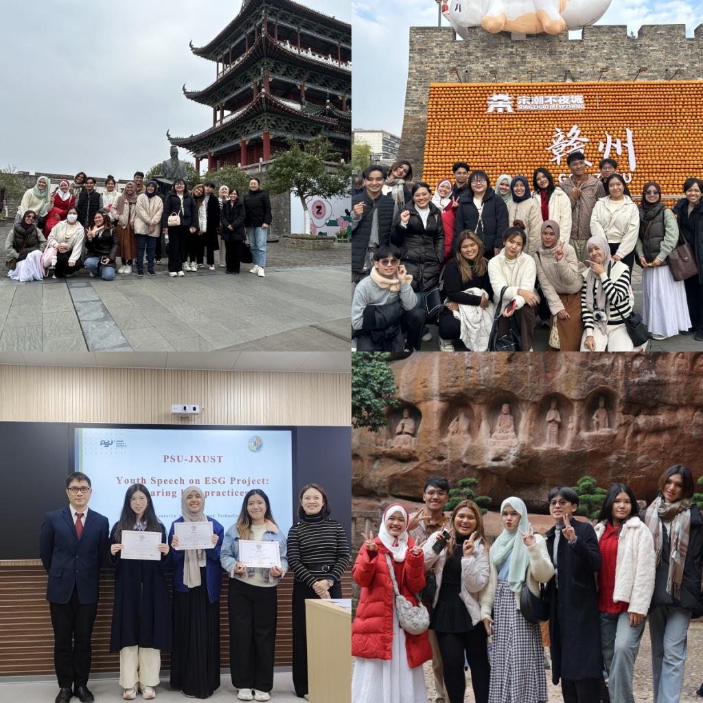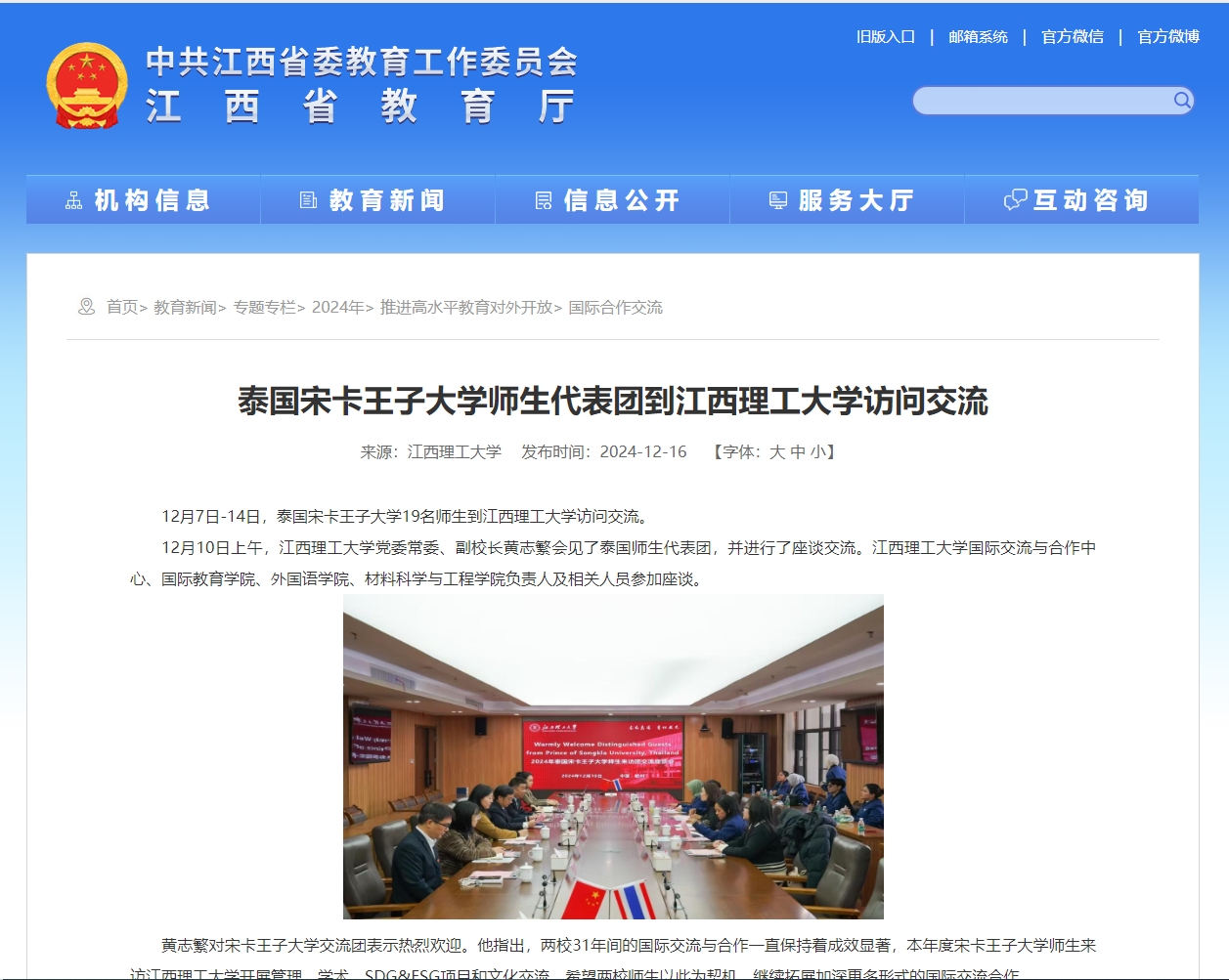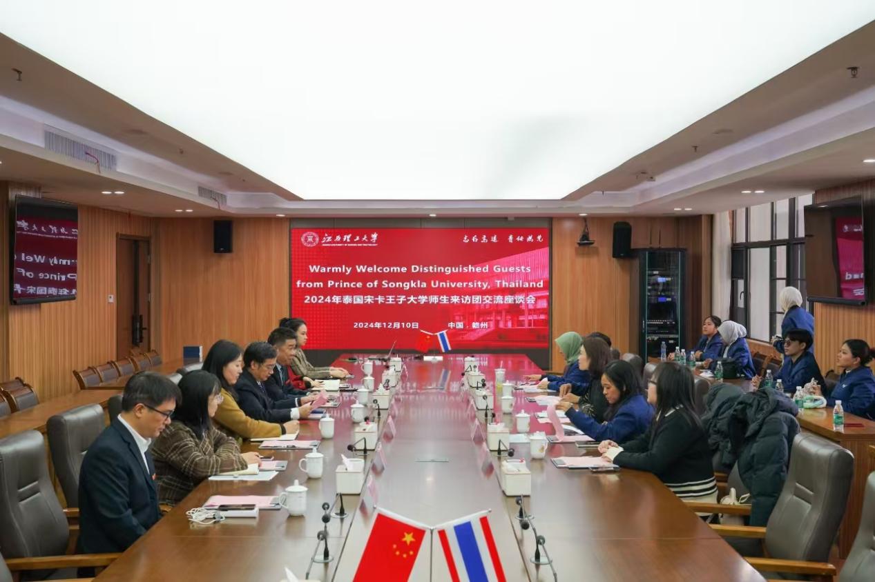 、理学院、材料科学与工程学院、建筑与设计学院、外国语学院、化学化工学院开展了学术、管理交流,并赴“江南第一石窟”通天岩、八境台、古浮桥、古城墙、江南宋城、上犹阳明湖等地感受生态、人文的氛围,了解中华优秀传统文化,同时,还举办了中泰文化交流晚会,通过《Rabum Kritdapinihan》《Thailand land of rich culture》《千年的祈祷》《流水桃花》《Finale Show》等节目与游戏互动,进一步加深了两校师生的友谊。