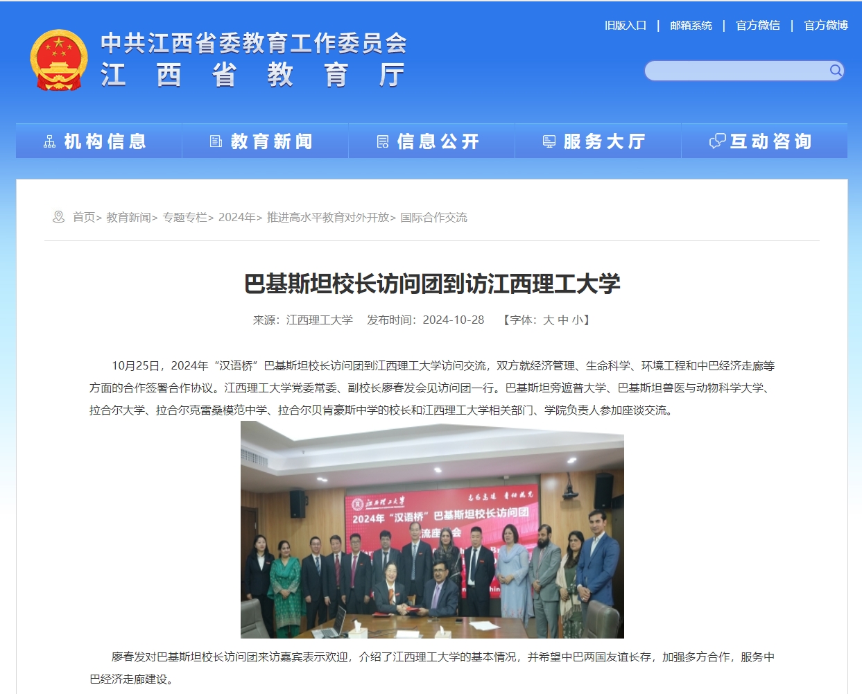 10月25日,2024年“汉语桥”巴基斯坦校长访问团到奈飞工厂 访问交流,双方就经济管理、生命科学、环境工程和中巴经济走廊等方面的合作签署合作协议。奈飞工厂 党委常委、副校长廖春发会见访问团一行。巴基斯坦旁遮普大学、巴基斯坦兽医与动物科学大学、拉合尔大学、拉合尔克雷桑模范中学、拉合尔贝肯豪斯中学的校长和奈飞工厂 相关部门、学院负责人参加座谈交流。